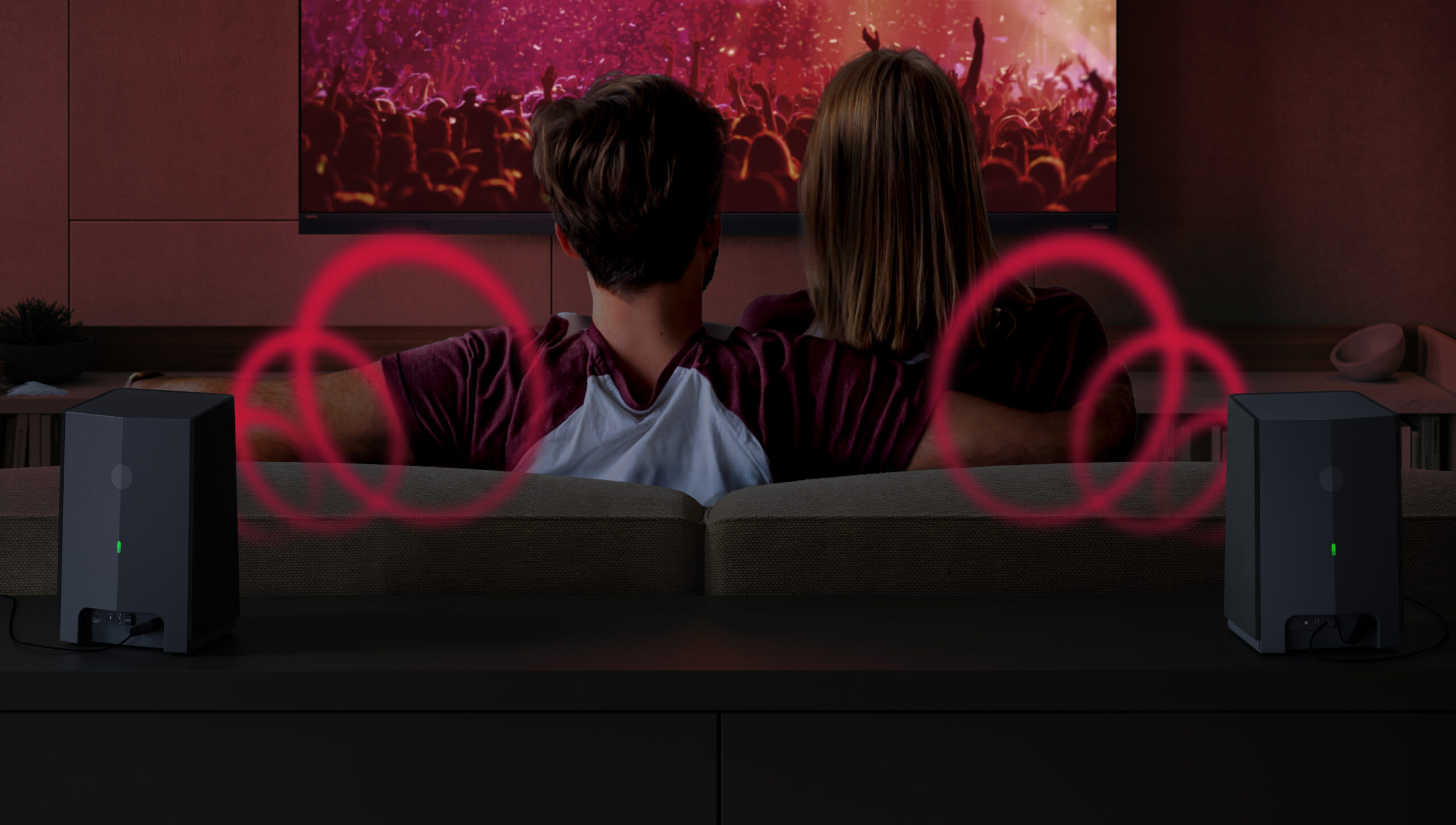 For immersive, full surround sound, including Dolby Atmos®, the AQUOS Wireless Surround Rear Surround Speakers work with your compatible Sharp AWS TV’s speakers to create a 4.0 channel system. This setup offers precise placement of audio “objects” in the 3D space around you.